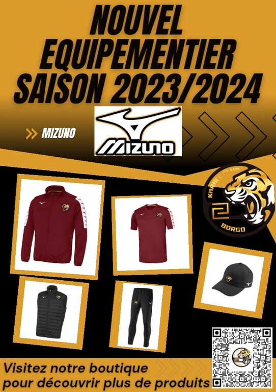 Chers adhérents, nous sommes ravis de vous présenter notre offre pour la saison 2023/2024 du club karaté Borgo. Nous vous proposons une sélection de vêtements de qualité de la marque Mizuno, ainsi que des équipements et accessoires arborant notre logo. N'attendez plus, rendez-vous sur notre boutique pour afficher fièrement les couleurs du karaté Borgo !
